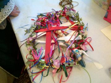 Picture of the symbolic 'Hoop and Wand' joined with ribbons (representing the female and the male joining together) - the actual 'Handfasting, tying the knot part (All tied together, then we let them slip their hands out, keeping the hoop and wand tied together)
